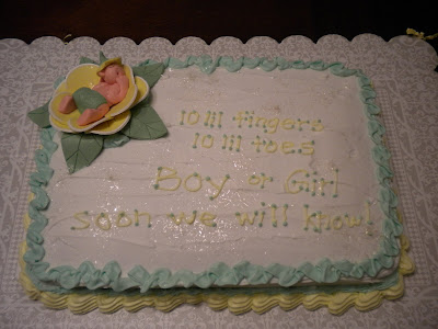 Everything was so pretty. The cake said, "10 lil fingers 10 lil toes Boy or girl soon we will know." Family and friends gathered around as they cut into the cake. Those guessing boy stood on one side and girl on the other. I thot boy even tho wishing girl. Boy would have been fine but I look forward to sewing girlie stuff and doing girly things. I even wore pink undies in hope!